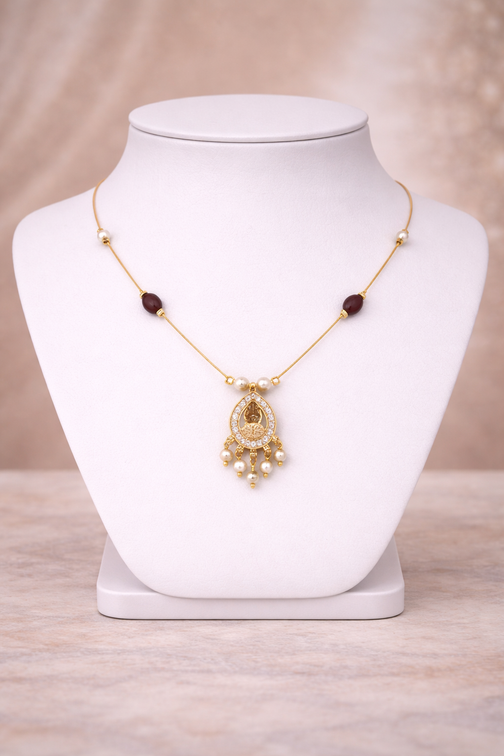 A refined gold-tone necklace featuring maroon bead accents and a beautifully detailed temple-style pendant, highlighted with CZ stones and graceful pearl drops. Elegant and lightweight, this piece is perfect for festive occasions, traditional wear, and timeless ethnic styling.