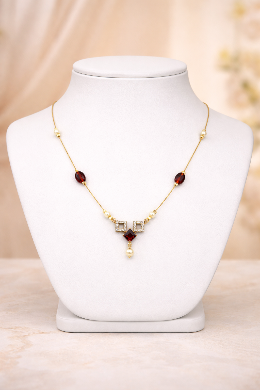 A delicate gold-tone necklace accented with deep red stones, subtle pearl details, and sparkling CZ square elements. Lightweight and refined, this elegant piece is ideal for festive occasions, office wear, or effortless everyday styling.