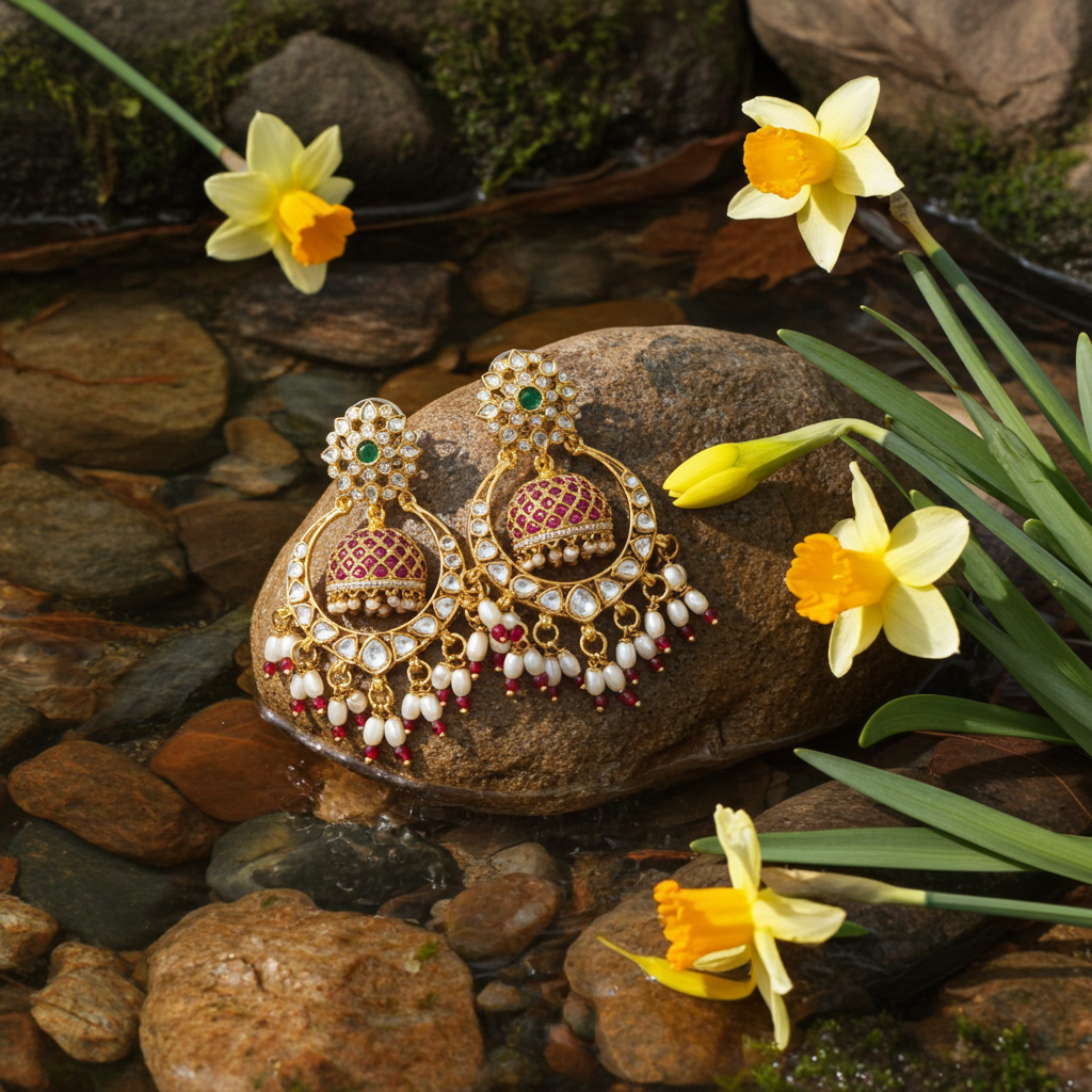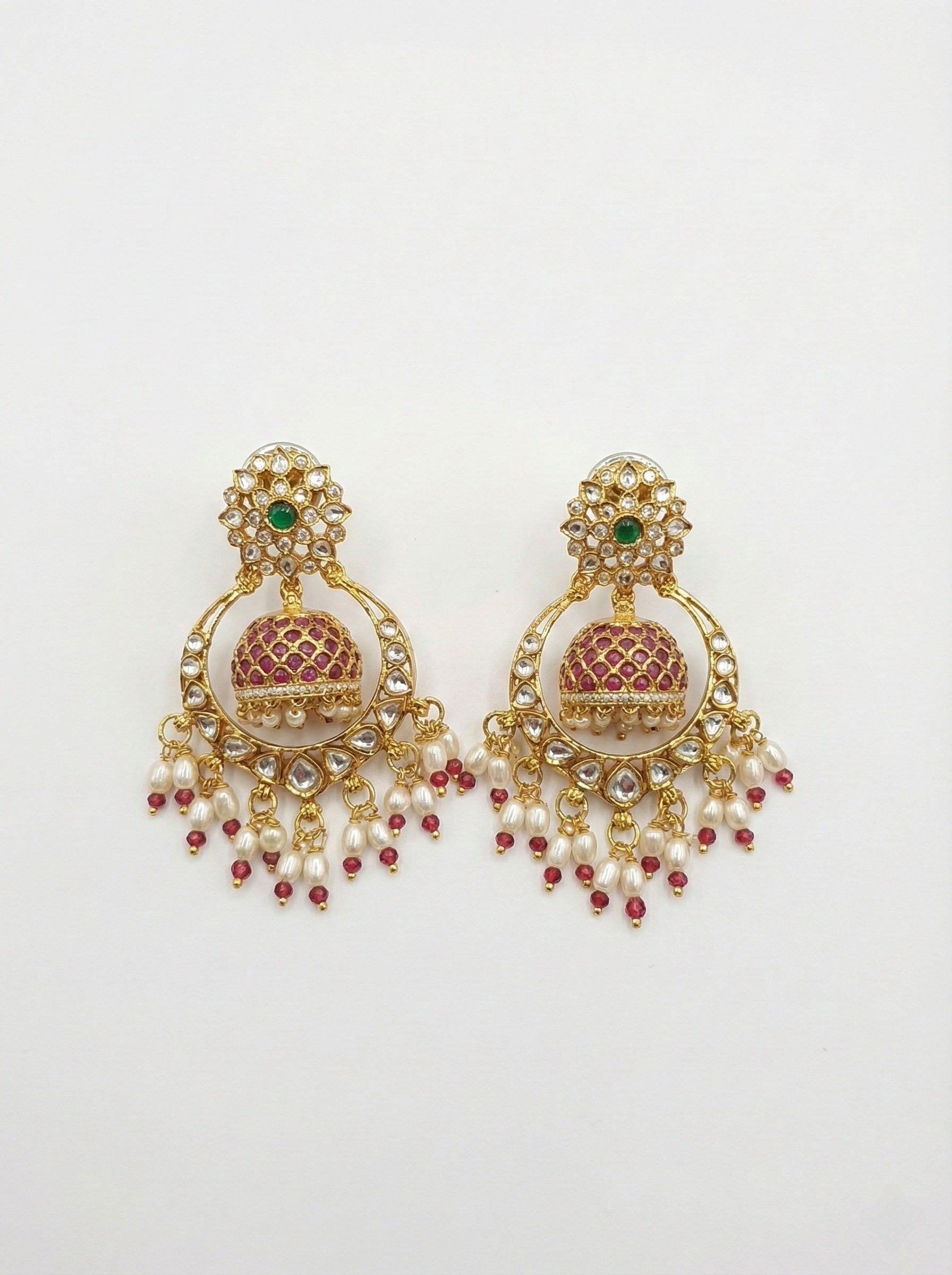 Suspended below is a beautifully detailed ruby-pink dome jhumka, framed within a circular stone-studded halo. Delicate pearl and ruby bead drops cascade gracefully, adding movement and a festive touch to the design. Lightweight yet visually rich, these earrings are designed to stand out while remaining comfortable to wear.