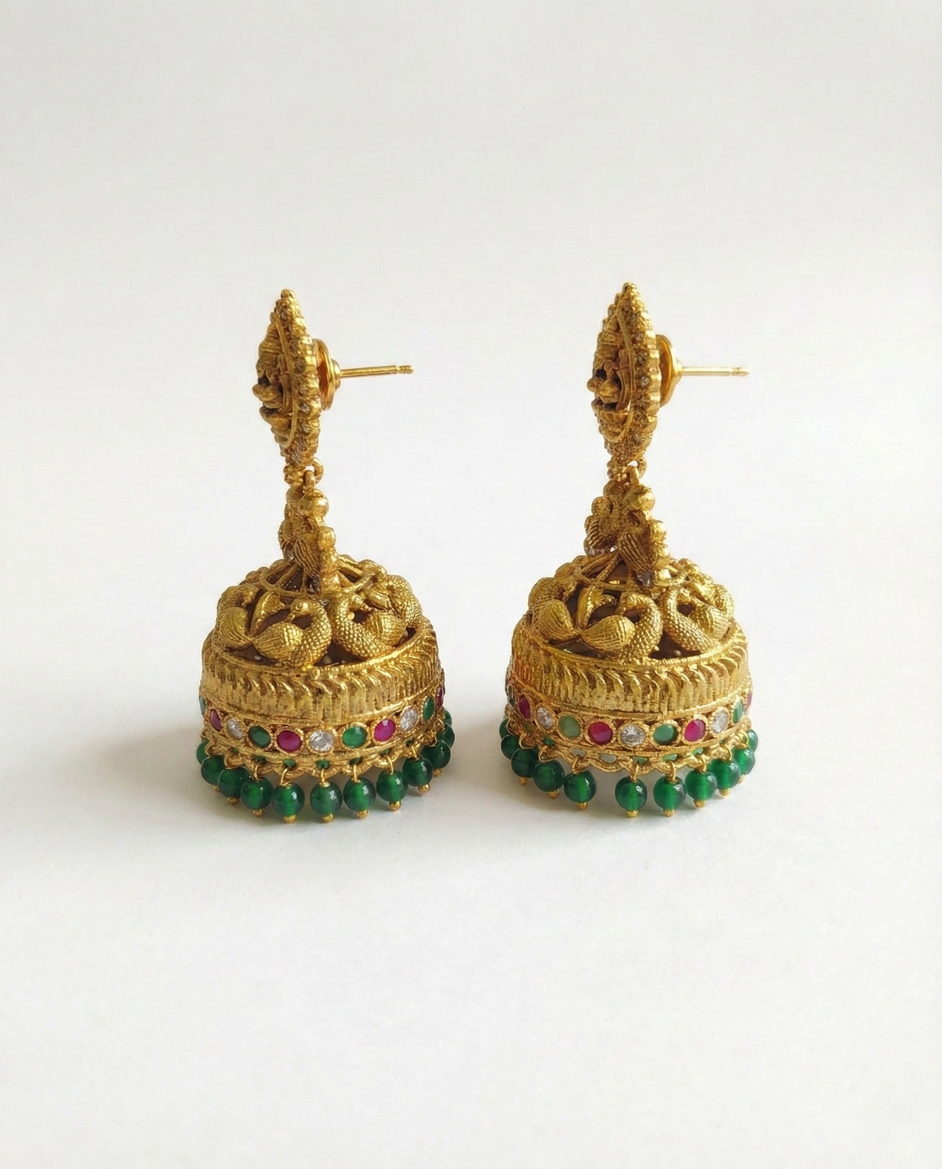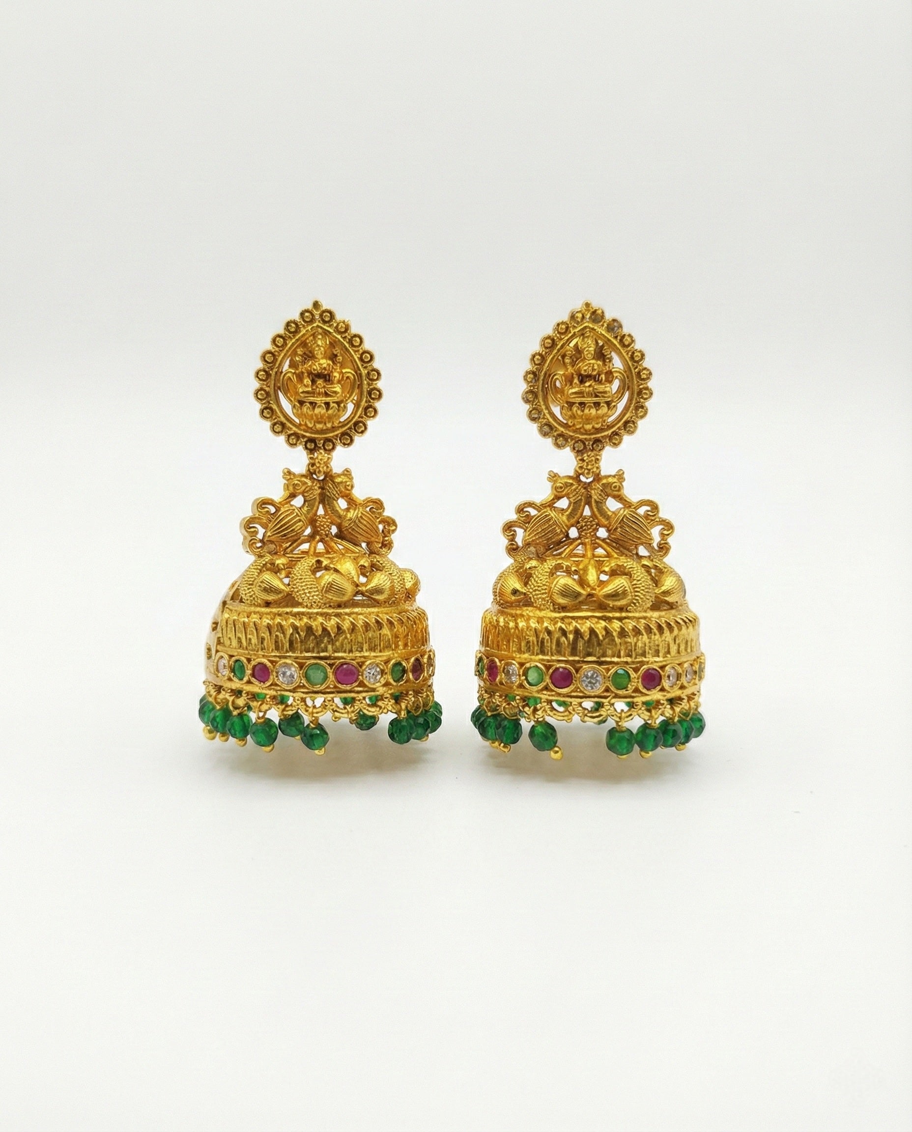 The design is finished with delicate green bead drops, adding graceful movement and a festive touch. Every element reflects classic temple jewellery aesthetics — bold, sacred, and beautifully handcrafted in appearance.