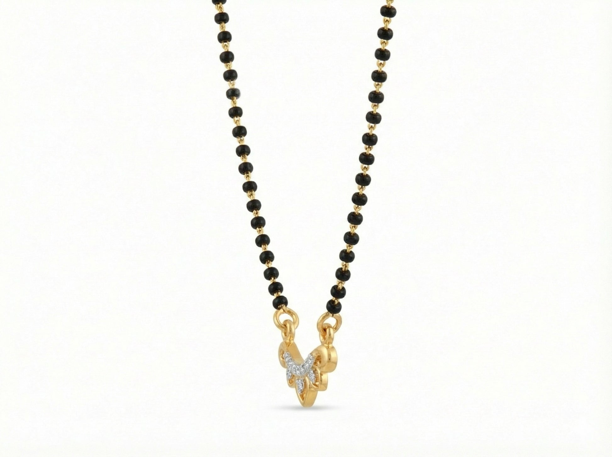 This elegant mangalsutra necklace features a classic black-beaded chain paired with a beautifully crafted gold-tone pendant highlighted with subtle sparkling clear stones. The pendant’s graceful, symmetrical design adds a refined touch while keeping the overall look minimal and sophisticated.