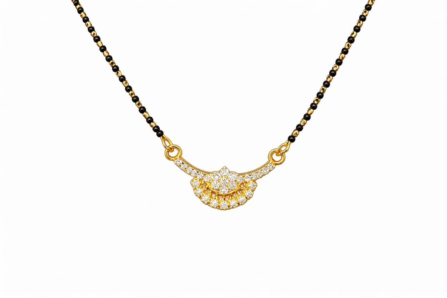 Add a graceful touch to your everyday look with this Gold-Tone Designer Mangalsutra Necklace. Featuring a traditional black beaded chain and a beautifully curved pendant encrusted with sparkling zircon stones, this piece blends classic symbolism with refined elegance.