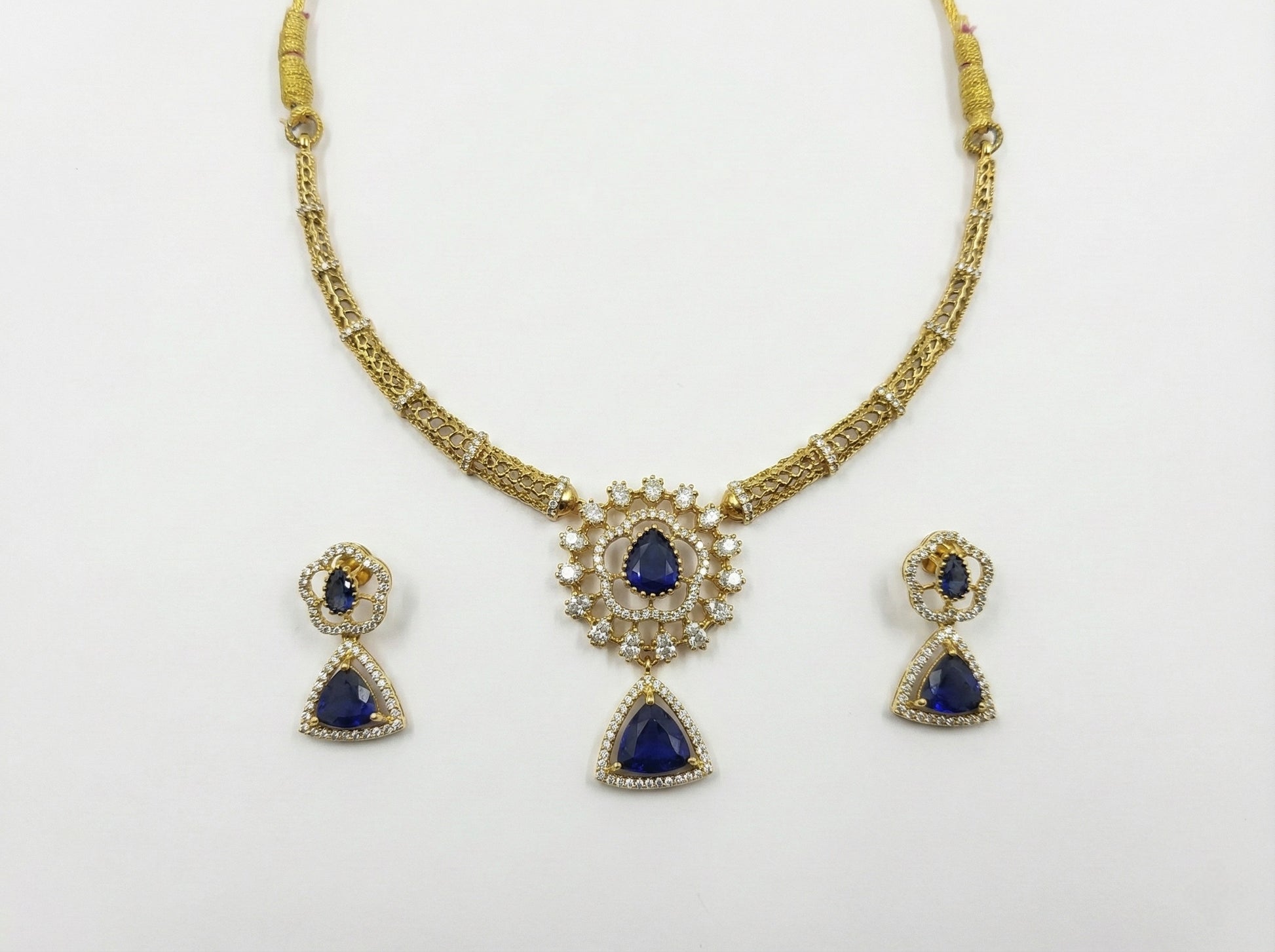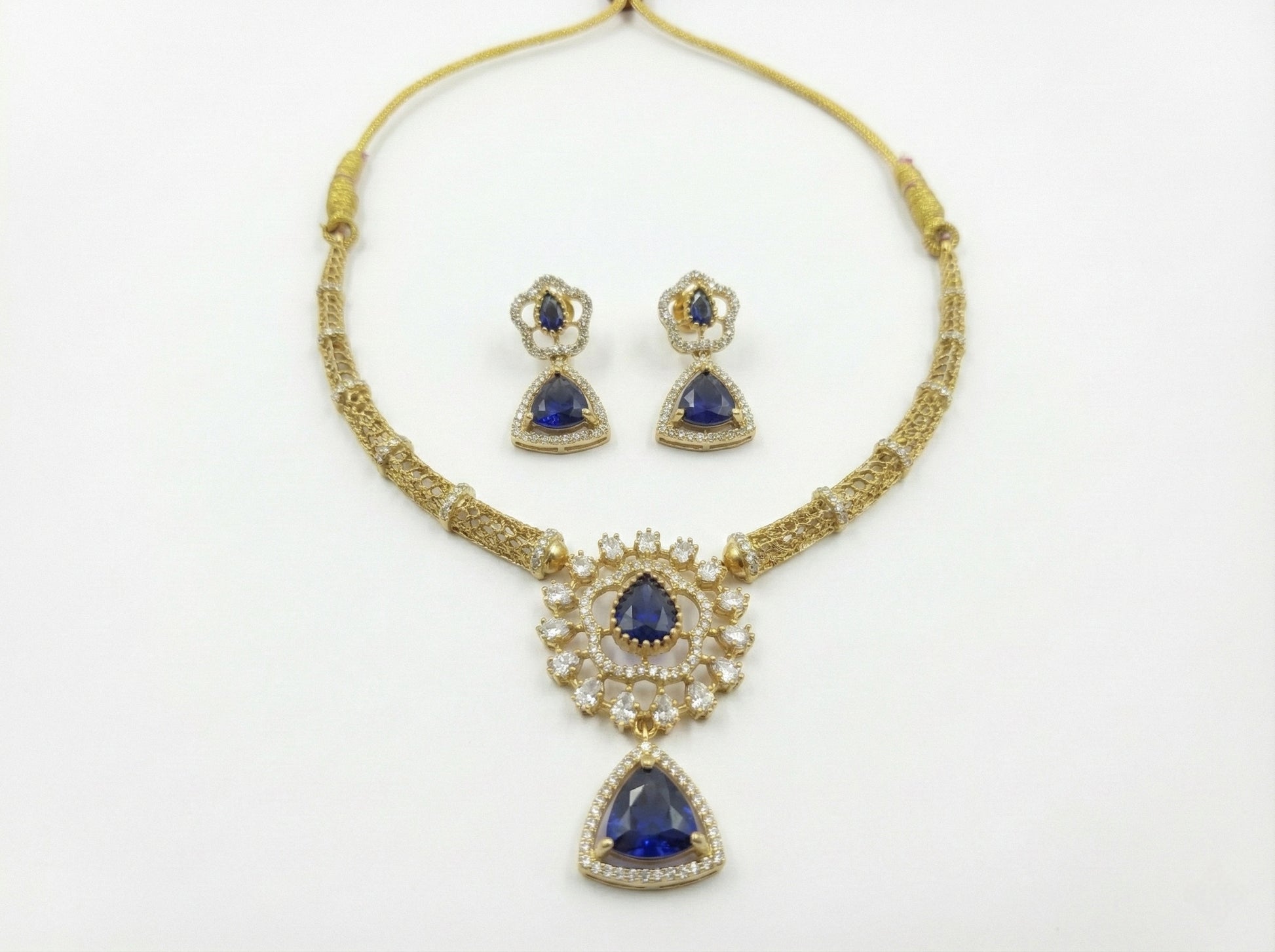 A luxurious gold-tone necklace set featuring deep royal blue, teardrop-shaped stones, beautifully framed with sparkling clear accents. The necklace showcases an intricately crafted chain leading to a statement central pendant—layered with fine detailing and a graceful dangling blue stone that adds movement and drama.