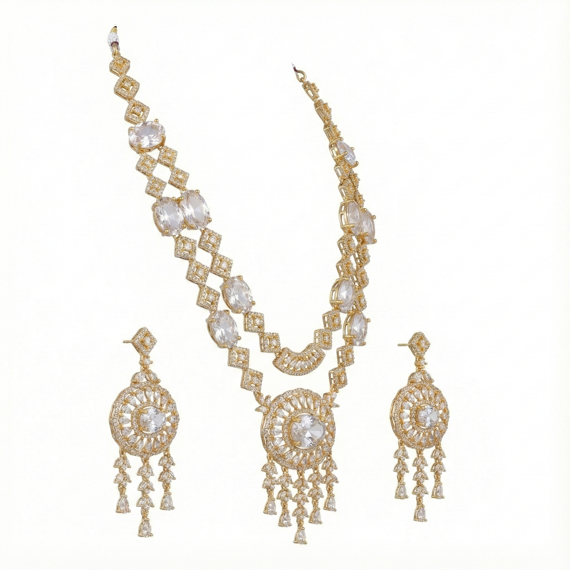 When elegance meets precision, the result is pure brilliance. This jewellery set is designed to catch the light from every angle, blending structured geometry with graceful sparkle for a look that feels refined, radiant, and effortlessly luxurious.