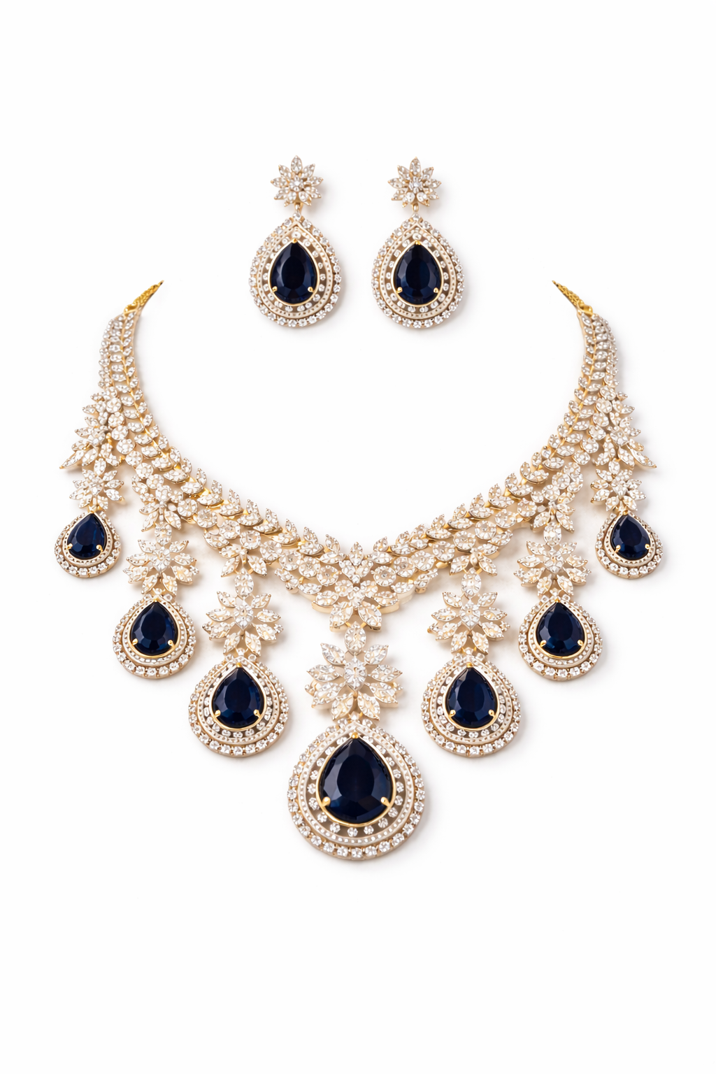 An opulent necklace set adorned with deep sapphire-hued teardrop stones and shimmering diamond-look floral motifs. Intricately crafted with cascading drops and paired with matching statement earrings, this show-stopping design is perfect for weddings, receptions, and grand evening occasions.